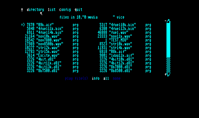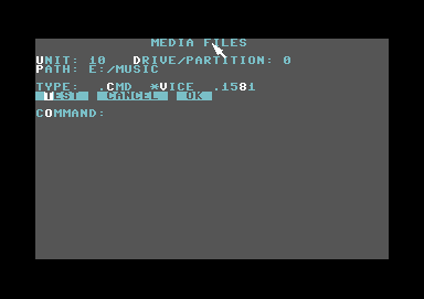 The Command option lets you issue a command on channel 15 to your device. You might want to scratch or rename a file, etc. After pressing return the command will execute and the response from the drive will display at the top of the screen. Important Note: clicking OK on this screen will re-set the device drivers used by Media Player 128. If you change your hardware configuration, it is important that you access this Config menu and select OK before you try to read a directory or play any files. If you fail to do this, the wrong drivers may be used and the machine may lock up. For example, if you start MP128 from a 1541 unit 8, but then turn off your 1541 and turn on your 1581 (also unit 8) then the software may crash when trying to read the directory. The same goes for using the 'swap device' button on a CMD-HD or when turning True Drive Emulation on/off in VICE. Remember, if you change your hardware configuration then access this menu and select OK.