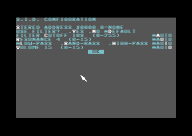 The editing options are rather crude in this version. You can Delete an item from the play list or Clear the entire play list. Unfortunately you can not re-order items in the playlist (also on the TODO list for the next version). More importantly, you can save your playlist as an .M3U file -- so the next time you use MP128 all you need to do is select the playlist instead of picking out files manually. Before saving your playlist, be sure you are in the correct directory first, because the save option only lets you specify a filename. It will however warn you if the file already exists, and if you choose OK it will replace the existing playlist. For either audio or video playback, MP128 will show you some information about the current file in your playlist before it actually starts playback. If you are using an REU to buffer the file, the screen will flash colors as it loads the file into the REU. Every change in color represents 4kiByte. After cycling through all 16 colors, your REU has loaded one bank (64kiByte). This means if your file is 1MiByte in size, you should see the colors go through 16 complete cycles (or if you care to count 256 screen flashes). After the REU is loaded you may see the message READY TO PLAY. If this appears, you need to press CLICK/FIRE/SPACEBAR before the file actually starts playing. This is because large files can take a minute or more to load into an REU and gives you a chance to confirm the start of playback. If the file loads quickly (or you do not use an REU), you will not see the message. The default timeout is 5 seconds. If buffering takes less than 5 seconds, no message will display. You can change the timeout value on the Config/Loader page. When playing a video, the 40-column VIC screen will show the video. If you also use the 80-column screen, it will only show the file statistics. When playing an audio file, the player will show a buffer graph (either 40 or 80 column screen). It indicates how full the audio buffer is -- if your storage device is fast enough, the bar should be pegged to the right side of the screen. It is normal for the last bits of the graph to fluctuate a little during playback. If your storage device is too slow, you will the see the bar slowly "drain" until it is "empty" at which point you will hear the audio loop and the graph will magicly "refill." This should never happen when playing from an REU. If this happen when playing from a fast-serial device, it means your hardware is too slow. If you have an REU, then you should reduce the DateRate on the Config/Loader screen -- this will tell MP128 that your device is slower than it thought and it will instead use your REU to buffer the audio file. Many audio files will blank the 40-column VIC screen during playback. More specifically, only audio files with a sample rate very near double the VIC's raster rate can play without blanking the screen. For PAL machines, the two-raster rate is about 7778 Hz and for NTSC about 7846 Hz. In other words, if the audio is about 7816 Hz then the VIC screen should not be blanked. However, this only applies to 2-bit and 4-bit audio files -- the 8-bit audio files always blank the VIC screen. While a file is playing, you can use CLICK/FIRE/SPACEBAR to pause or resume playback. You can skip to the next file in your playlist with a right-click of the mouse, pressing UP on your joystick, or pressing 1 on the keyboard. You can abort playback of all files and return to the menu by pressing both buttons on the mouse, by pressing UP+FIRE on your joystick, or pressing STOP on the keyboard. Well that describes all the neccessary things. An additional Configuration option let's you tune the playback of audio files (or the audio of videos). Select SID from the Config menu and you should see a screen like this (40 column):