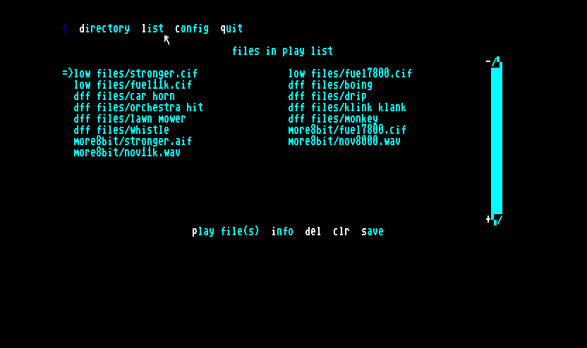 Now to the purpose of the program, to play your files for entertainment! After selecting one or more files from the Directory screen, the option Play Files will become available. Simple click that option or press P on the keyboard to play all the files in your playlist. You can review or edit your playlist by clicking List from the main menu at the top of the screen. It should look something like this: