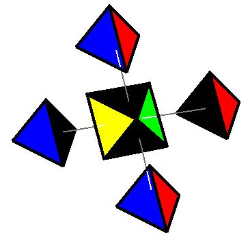 - four (4) tetrahedron "tips", each with 3 visible facets (colored triangles) and 1 hidden facet