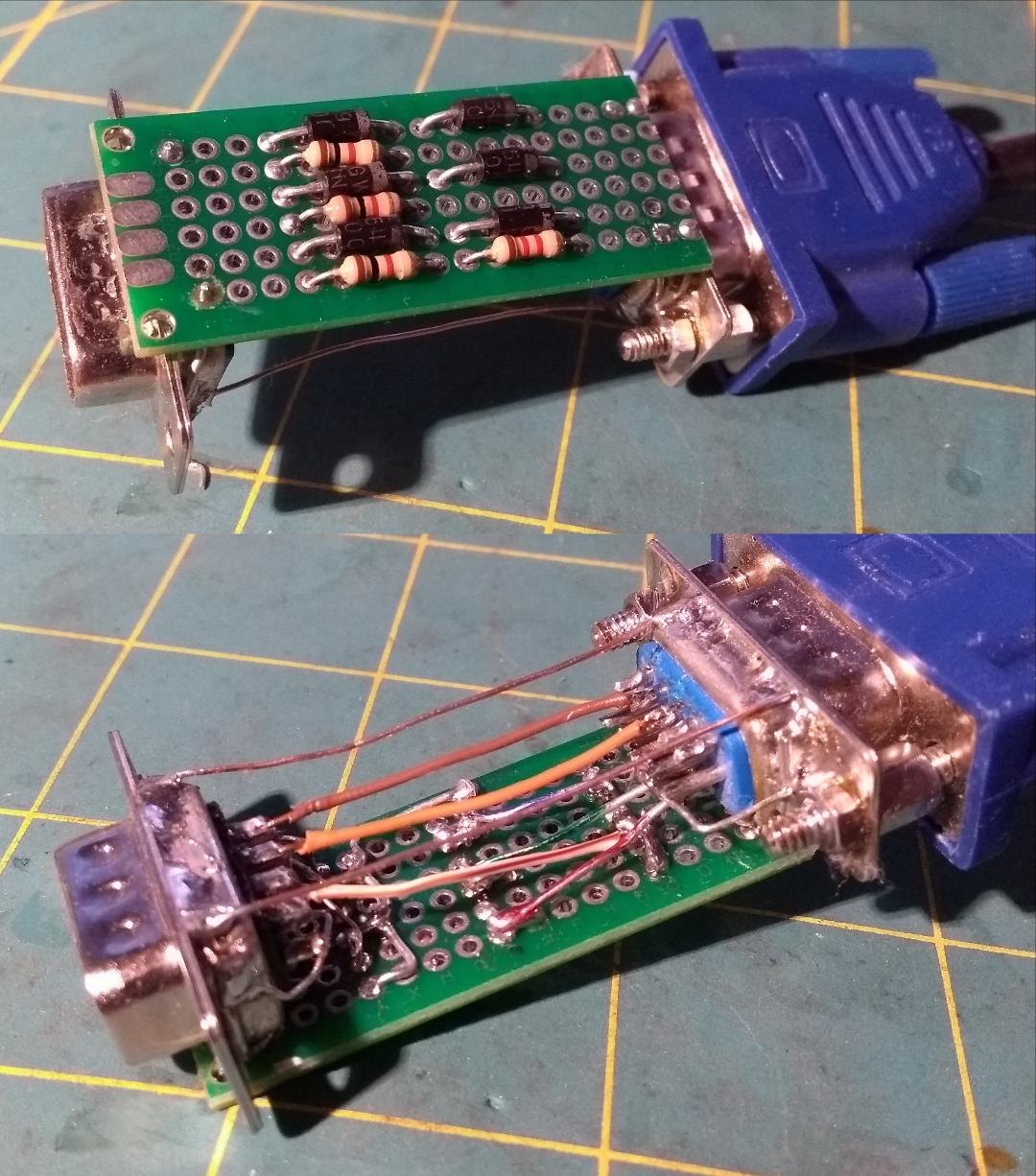 Kyle Kelbert reports that my "Pull Both v2" (at the top of this page) works without any VGA adapter! His computer is a Tandy 1000HX and his monitor is a Daenyx DN-153. Based on his description it sounds like CGA to RGBa conversion. He noted that only a few monitors will work without a VGA adapter (which is why I call this CGA to RGBa). Because a VGA adapter wasn't used, he was able to build my circuit as a small "dongle" board. Kyle also sent an image from King's Quest (CSDb entry / Wikipedia article). Aside from the moiré patterns (caused by the camera) I don't see any obvious problems, but he reports a mild "color bleeding". However, his "dongle" (see above) is using "power" diodes (1N4001) when "switching" diodes (like 1N4148) should be used. Update: Kyle emailed me to say that using "switching" diodes 1N4148 fixed the "color-bleeding" problem! In summary, do NOT expect good results with "power" diodes like 1N4001. See also a similar "CGA" section on my "VGA ultimate" page. © H2Obsession, 2012, 2013, 2014, 2019, 2021 Screen shot of HP Monitor © Miro Karkus, 2013. Used with permission. Images of "dongle" and Tandy game © Kyle Kelbert, 2019. Used with permission. |