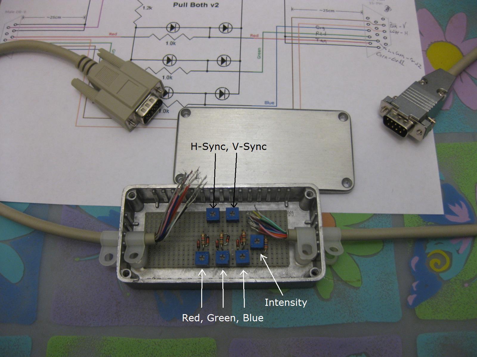 I've built two circuits to get all 16 colors with a VGA adapter. The simpler one comes first, and can be used with a VGA adapter that accepts seperate Horizontal and Vertical synchonization signals (like the one from Ambery already mentioned). Scroll down to the Composite Sync section for a more complex version needed for some fussy devices (like the GBS-8220). So first, Miro Karkus asked me to build an RGBI converter for use with his RGB to VGA adapter. I'm glad to report that it works! Below is the schematic diagram if you would like to build one yourself. On the left side is the male DB-9 connector that goes to the C128. In the center is the pull-both circuit that adds Intensity to the R,G,B lines. On the right is the male HD-15 connector that goes to your VGA adapter. Because I don't own the VGA adapter he does, I added 1k Ohm variable resistors to all the VGA output lines (except ground). These are not shown in the schematic (may not be needed, depending on tolerance of VGA converter that you use). I set them to about 250 Ohms as this seemed to drop the voltage down to what his converter needed. As long as I was adding variable resistors, I replaced the 1.2k Ohm resistor (for the C128 Intensity line) with a combination of 470 Ohm (fixed) and 1k Ohm (variable) resistors; I tuned it to 1.2k Ohm. I built it in a metal case, see photo below. (The photo is before I connected the mess of wires; I should have taken a finished photo... oh well.) Note this solution gives 16 "true" RGBI colors using passive technology (no power supply needed). A minor problem is that Commodore monitors were built with a special "brown" circuit. That is, one of the 16 colors (so-called dark yellow) was changed to look more like brown by decreasing green and/or increasing red more than a "true" RGBI signal. This is a minor issue, in my opinion, because most text and images look fine with dark yellow in place of brown. However, if you are interested in an active solution (requires seperate power supply and more parts) that will give "true brown" then see my "Ultimate" solution (Historical links: thread at Landover BBS or thread at Vintage Computers.) The parts to build this RGBI adapter cost between US $20.00 ~ $40.00, depending on what type of case (if any) is made. The circuit itself if fairly simple to build, but making the case and connecting all the wires will take a fair amount of time. Expect to spend half a day on the project if you are proficient at this sort of work; a full weekend otherwise. Of course, you still need an RGB to VGA converter and VGA monitor... I assume you already have a VGA monitor :) Anyway, Miro was kind enough to send me a photo of the working result. I think it looks acceptable, but not great. I'm not sure if the problem is bad photograph, his VGA converter, or the monitor itself (probably a combination). His photo shows standard text mode, but he reports interlaced and bitmap modes work too. ![]()