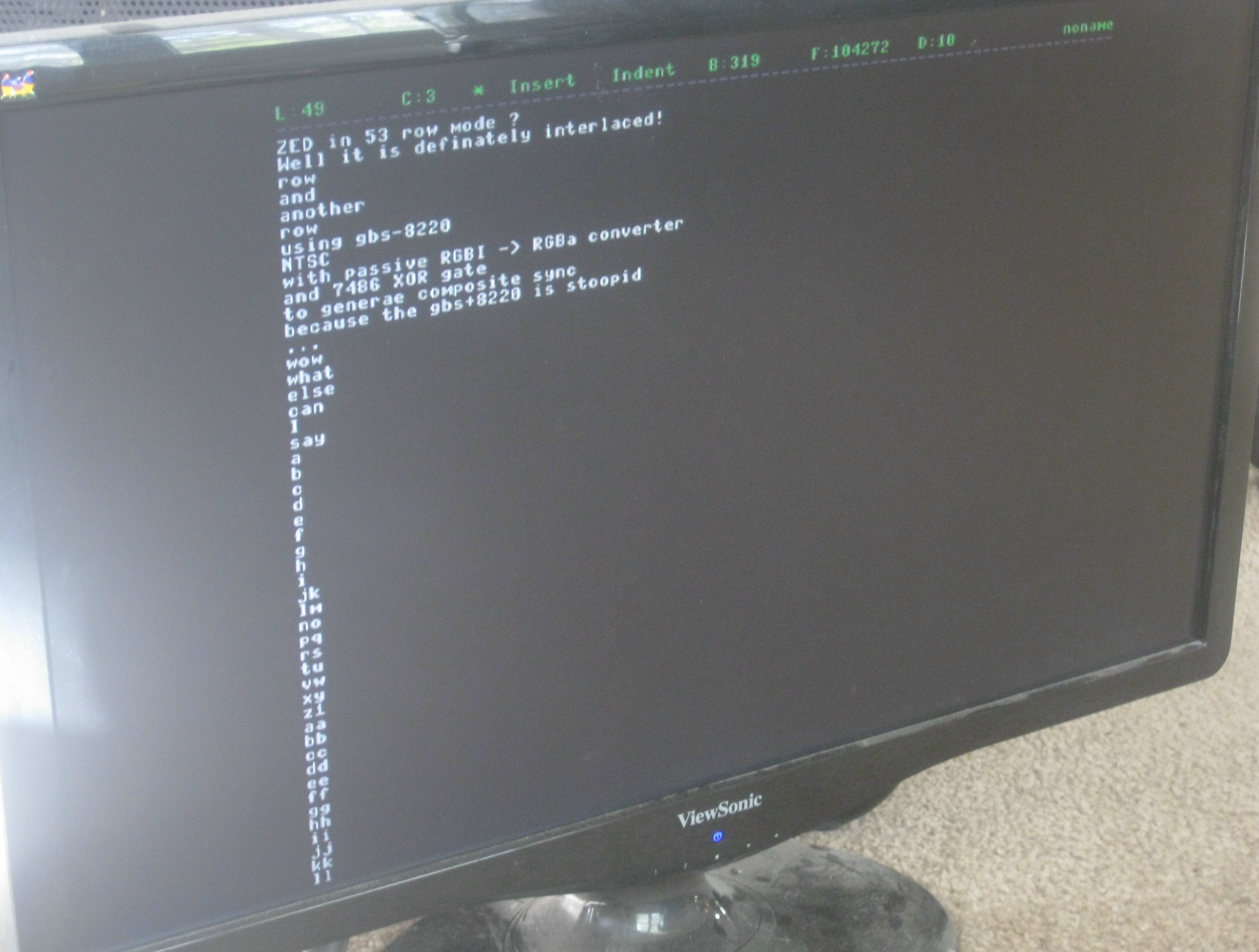 These sound like they are related, and playing with them gives somewhat similar results (mostly messing up the picture). However they are in two different menus. The Clamps are in the Geometry menu and the Coasts are in the Picture menu. Long story short, ignore the Clamps because the default settings work fine (well, after you fix the Coasts). So below is a photo showing the default settings of the Picture Menu. In the background you can see the image is still "torn" as in the photo above. As far as I can tell, the Coast St sets the "start coasting (ignore horizontal sync)" raster while the Coast Sp sets the "stop coasting (resume using horizontal sync)" raster. Well regardless of my theories, the below photo shows the settings that actually work... With a solid 8-color display, I went about building my "Pull-Both" RGBI to RGBA circuit. That was the easiest part. Below is the result with standard text mode showing all 16 colors. Unlike my S-Video adapter (where dark yellow kind of resembled brown) this VGA version clearly needs a "brown fix". Otherwise I was quite happy with the colors, contrast, and shapness. Sorry the photo was taken in broad daylight so the contrast is a bit low. Next I wanted to see how the GBS-8220 would do with interlace video. Below is 51-row mode of the ZED text editor. The results were a crisp, flicker-free image. Considering I was using an LCD-type monitor, I am not surprised about the "flicker-free". Unfortunately I did not have a CRT-type monitor to do further testing. Below is a schematic diagram of the circuit I used, so you can build one yourself. Or I can build one for you if you have money to spend (contact me). I put in a 3k Ohm potentiometer to be able to adjust the Intensity, but the final settings was near the middle. In other words, about 1.2k Ohm as shown in the simpler version of my "Pull-Both" circuit. The thing that makes this second version slightly more complex is the need for the 7486 XOR Chip. It needs to be powered by +5V which is available off the GBS-8220 board (only 1 of the 4 XOR gates is used, I believe you could make a "brown fix" with the other 3). ![]()